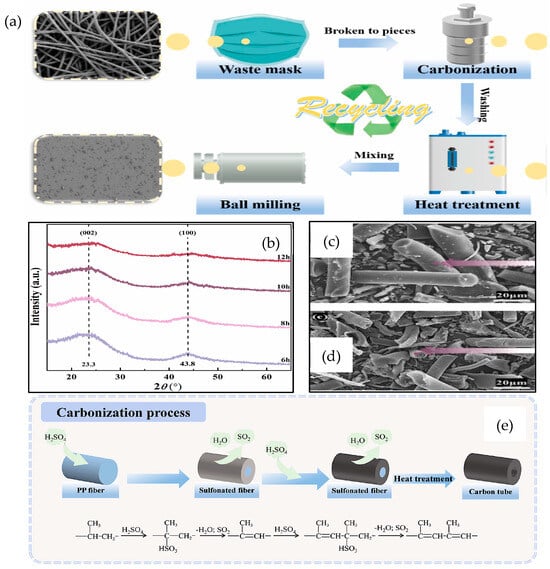 (a) Procedure of carbonization synthesis combined with ball milling, (b) XRD spectra of amorphous graphitic carbon, SEM images of FM waste for (c) 10 h carbonization time, (d) 10 h carbonization time with heat treatment, and (e) The derived structure of the PP fiber of FM waste into carbon tube [26]. Copyright 2023, Elsevier.