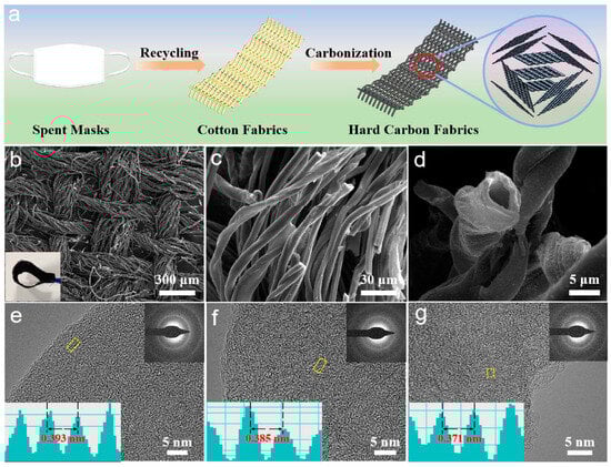 (a) Carbonization process of FM waste-derived hard carbon fabrics, (b–d) SEM images of hard carbon fabrics at 1300 °C carbonization temperature with different magnifications, TEM images of hard carbon fabrics at different carbonization temperatures: (e) 1200 °C, (f) 1300 °C, and (g) 1400 °C (the insets and yellow frames are the corresponding SAED) [36]. Copyright 2023, Elsevier.