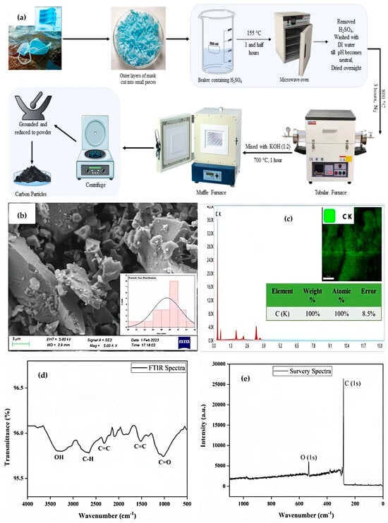 (a) Carbonization process of FM waste-derived carbon nanoparticles, (b) FESEM image, (c) EDS spectra and mapping, (d) FTIR spectra, and (e) XPS spectra of the synthesized carbon [9].