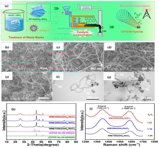 (a) Fabrication process of CNT/Ni hybrids using catalytic carbonization, SEM images of CNT/Ni hybrids (b,c) WM/10Ni(OH)2/NiCl2, (d) WM/20Ni(OH)2/NiCl2, and (e) WM/50Ni(OH)2/NiCl2; TEM images of CNT/Ni hybrids from (f) WM/20Ni(OH)2/NiCl2, (g) WM/50Ni(OH)2/NiCl2, (h) XRD spectra of CNT/Ni hybrids, and (i) Raman spectra of CNT/Ni hybrids [29]. Copyright 2021, Elsevier.