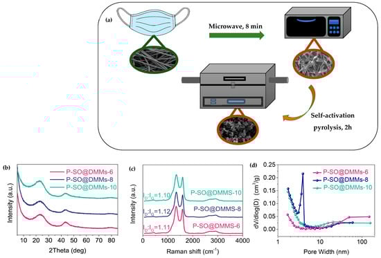 (a) Synthesis process of porous carbon by microwave carbonization technique, (b) XRD, (c) Raman spectra, and (d) pore width of synthesized porous carbon [39]. Copyright 2022, Elsevier.