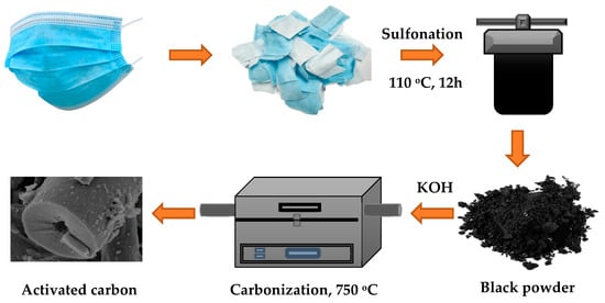 To date, different kinds of plastic wastes such as polypropylene (PP), polyethylene (PE), polyurethane (PU), and polystyrene (PS) can be reformed into carbon materials due to their characteristics of high source of carbon [9,10]. Since PPE mainly consists of various types of plastics, as mentioned, the transformation of PPE waste into carbon-based materials has drawn more attention among researchers, where various types of approaches have been developed for the treatment and utilization of waste. Carbon-based materials, including graphene, carbon dots, carbon nanotubes (CNTs), carbon nanosheets, and porous carbon, have been reported to be produced using the carbonization method [11]. This method is not only controllable and energy-efficient but also effective in disinfecting the viruses using high temperatures throughout the synthesis process [12]. Moreover, carbon-based materials show great promise for a wide range of possible applications, including energy storage, catalysis, water treatment, CO2 capture, transistors, photo-electric devices, and other related devices due to their superior morphological, chemical, mechanical, and electrical characteristics [13].
