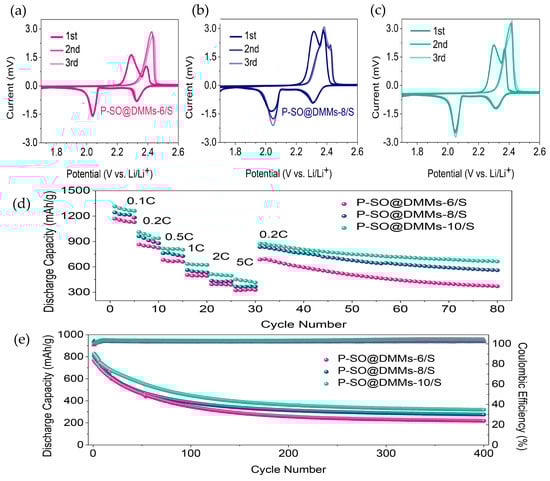 Cyclic voltammetry of porous carbon as cathode electrode (a) P-SO@DMMs-6/S, (b) P-SO@DMMs-8/S, (c) P-SO@DMMs-10/S, (d) rate performance test of P-SO@DMMs/S cathodes, and (e) cycling capacity of P- SO@DMMs/S cathodes [39]. Copyright 2022, Elsevier.