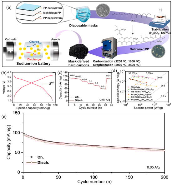 In an equivalent way, Zhang et al. [49] produced hard carbon by treating face mask waste with sulfuric acid at different sulfonation temperatures (120 °C, 140 °C, 160 °C, 180 °C, and 200 °C) for 10 h, followed by carbonization at 1200 °C. The thermal stability of polypropylene (PP) molecules is improved by the sulfonation treatment, reducing excessive breakdown and gas release during carbonization. This treatment adds oxygen functional groups that encourage cross-linking between PP chains and increase structural disorder. The optimal hard carbon was produced at a sulfonation temperature of 180 °C. They further used the optimum hard carbon (CM-180) as an anode for sodium-ion batteries. With a high degree of disorder and few surface imperfections due to sulfonation, the produced hard carbon anode at 180 °C of sulfonated temperatures achieves a high sodium storage capacity of 327.4 mAh g−1 along with good cycle and rate capabilities. When paired with an O3–NaNi1/3Fe1/3Mn1/3O2 cathode, the sodium-ion full cell achieves a high energy density (238 Wh kg−1) and retains capacity at ultrahigh rates, demonstrating the potential for battery applications.
