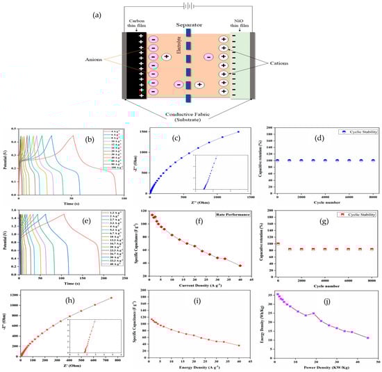 (a) Illustration of asymmetric capacitor (b) GCD, (c) EIS, (d) cyclic stability of the carbon thin film electrode, (e) GCD tests performed at 1.3 to 40 A g−1, (f) rate performance, (g) cyclic stability, (h) EIS study of the device, (i) specific capacitance vs. energy density, and (j) Ragone’s plot of the supercapacitor device [9].
