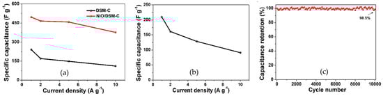 (a) Specific capacitances of the DSM-C and NiO/DSM-C electrodes, (b) specific capacitances of NiO/DSM-C//DSM-C ASCs, and (c) cycling stability at 2 A g−1 [34]. Copyright 2021, Elsevier.
