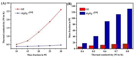 Thermal conductivities of PE-GE and PE-Al2O3 composites: (A) Relationship between conductivity and filler content; (B) A comparison chart of different fillers.