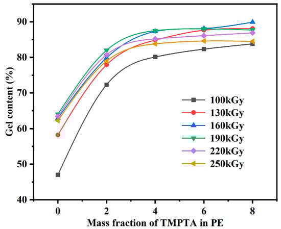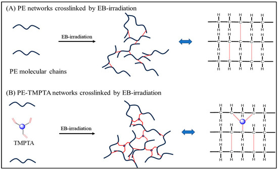 For an understanding of the crosslinking reactions occurring in PE chains, the crosslinking effects with or without TMPTA are suggested in Figure 3. Due to the multi-arm structure of TMPTA small molecules, they can generate rich free radicals even at a low irradiation dose. These free radicals will attend the crosslinking reactions of PE chains, which also yield many free radicals after irradiation. Obviously, TMPTA molecules bring about more crosslinking points, promoting the cross-linking degrees and stability of the 3D crosslinked structure.