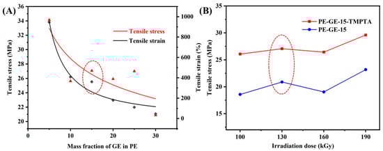 (A) Mechanical properties of PE-GE composites with different GE contents; (B) Mechanical properties of PE-GE composites (with or without TMPTA) crosslinked at different irradiation dosages.