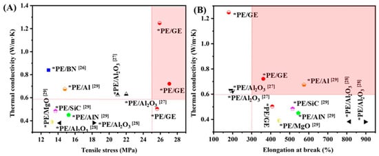 Comparison of thermal conductivity of different thermal conductive fillers. (A) Thermal conductivity vs. tensile stress; (B) Thermal conductivity vs. elongation at break [26,27,28,29].