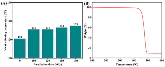 Thermal properties of PE-GE-15. (A) Vicat softening temperatures at different irradiation doses; (B) TGA curve after treating at 130 kGy.