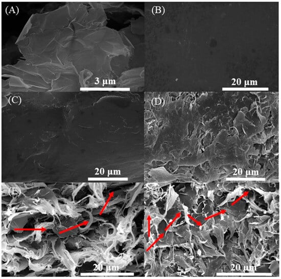 SEM photos: (A) Pure graphene; (B) PE-GE-15–130 surface; Cross sections at GE fractions of (C) 0%, (D) 5%, (E) 15%, and (F) 30%.