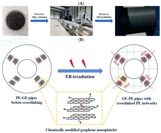 (A) Fabrication processes of EB-irradiated PE-GE-15 pipes; (B) Illustration of highly thermal conducting pipes with cross-linked structure.