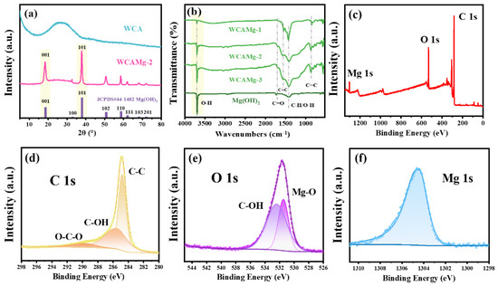 (a) XRD patterns of WCA, WCAMg-2, and Mg(OH)2, (b) FT-IR spectra of Mg(OH)2 and WCAMg-n, and XPS spectra of the composite WCAMg-2, (c) survey, (d) C 1s, (e) O1s, and (f) Mg 1s.