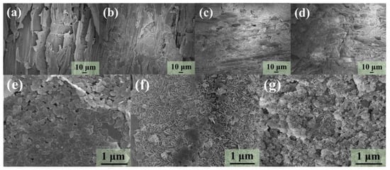 The morphology of WCA and WCAMg samples were examined using SEM. As illustrated in Figure 2a, WCA exhibits an irregular fibrous architecture containing interconnected cavities and channels. Morphological features are characteristic of biomass-derived carbon aerogels. However, observations of WCAMg samples (Figure 2b–d) find that surfaces of WCAs were covered. After the deposition of Mg(OH)2 nanoparticles, plate-like nanostructures with the size of about 200 nm were determined via SEM (Figure 2e–g). This result not only confirms the successful in situ crystallization of Mg(OH)2, but also demonstrates its effective anchoring on the WCA surface through interfacial bonding. WCAMg-1 displays aggregated Mg(OH)2 nanosheets that distribute across the WCA. While increasing the MgCl2 concentration, the prepared WCAMg-2 and WCAMg-3 show a morphology of progressive surface coverage by vertically aligned Mg(OH)2 nanosheets. These results also give the evidence that a high concentration of MgCl2 would result in a high load capacity of Mg(OH)2, agreeing with the discussion above.