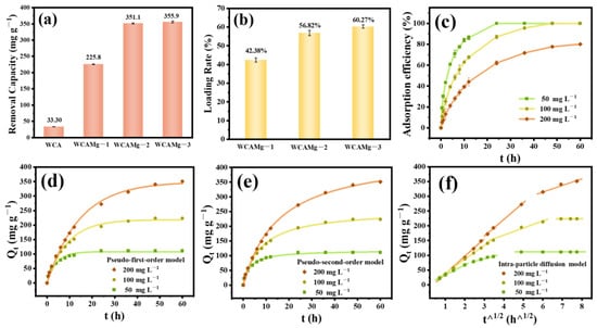 (a) Cd2+ adsorption capacity of WCAMg, (b) Mg(OH)2 loading ratio in WCAMg, (c) adsorption kinetic curves of WCAMg-2 at different Cd2+ concentrations, together with plots fitted by (d) PFO, (e) PSO, and (f) IPD models. All experimental procedures were performed in triplicate under independently controlled conditions, with quantitative data expressed as mean values.
