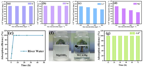 The effects of (a) K+, (b) Na+, (c) Ca2+, and (d) Mg2+ on the adsorption capacity of Cd2+ by WCAMg-2, (e) the adsorption efficiency of WCAMg for treating river water, (f) comparison diagram of pure Mg(OH)2 and WCAMg after adsorption, and (g) durability test for WCAMg-2.