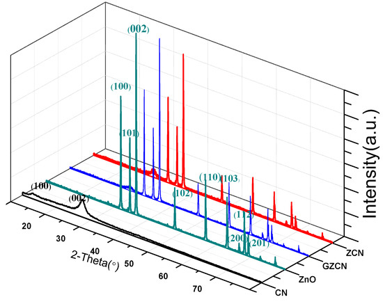 The crystal structures of ZnO, g-C3N4, ZCN, and GZCN were characterized by X-ray diffraction. As shown in Figure 1, pure g-C3N4 exhibits two distinct peaks at 13.7° and 27.4°, corresponding to (100) and (002) plane, which can be indexed to the characteristic in-planar structural packing and inter-planar stacking peaks of the aromatic systems in g-C3N4 [33]. The diffraction peaks of ZnO are well matched with the hexagonal crystalline structure, and the high intensity demonstrated its crystallinity and purity. Except the same peaks with ZnO, it was found that a characteristic peak at 27.4° of CN also existed in the XRD patterns of ZCN and GZCN, demonstrating that g-C3N4 has been successfully introduced into industrial ZnO. However, the peak of GO could not be found in the pattern of GZCN, which may mean that the content of graphene oxide was too small or that the intensity of the peak was too low. Furthermore, the intensity of the diffraction peak for ZnO did not changed, meant that the crystallinity of ZnO has not changed after adding GO and g-C3N4.