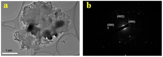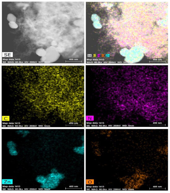 Figure 2a,b show the morphology of the ZnO and GZCN samples, respectively. It is clear that ZnO exhibits irregular particle morphology. The morphology of GZCN displays that ZnO particles are dispersed in the fluffy g-C3N4 sheet surface, and there are a few ZnO agglomerations, as shown in Figure 2b. Figure 3a is the TEM image of GZCN; it is obvious that ZnO particles were embedded in the g-C3N4 nanosheet, but GO could not be found, which is attributed to the low content of GO. The selected area electron diffraction pattern (Figure 3b) verified that ZnO has good crystal characteristics containing multiple single diffraction spots. In order to confirm the distribution of elements in the composite, element mapping is characterized, and the results are shown in Figure 4. According to the element mapping, the black particles are ZnO, and the flake structure is g-C3N4, demonstrating that ZnO particles are loaded on the g-C3N4 sheet.