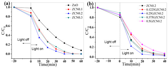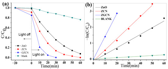 The photocatalytic activity was evaluated by degrading organic dye (RhB) under ultraviolet light and natural solar light. Figure 5a shows the performance of ZCNx under UV light. t equals 0, indicating the signal for turning on/off the light. When t is less than 0, this indicates dark adsorption. C0 reveals the initial concentration of organic dyes, and C denotes the concentration of organic dyes at a certain moment. When the content of g-C3N4 increases, the photocatalytic activity first increases and then decreases. When the mass ratio of ZnO to g-C3N4 is 1:0.2, ZCN possess optimum photocatalytic activity, of which the degradation rate reached 99.7% within 40 min. Figure 5b depicts the effect of GO on photocatalytic performance, and GZCN showed excellent photocatalytic performance when the content of GO was 0.25 wt%. For a comparison of the different samples, the photocatalytic degradation under UV light and reaction rate constants k are depicted in Figure 6. As shown in Figure 6a, it is obvious that the blank test only shows a small amount of degradation for RhB. ZCN shows a better photocatalytic performance than ZnO, which also demonstrates that introducing g-C3N4 can well improve the photocatalytic activity of ZnO. The GZCN composite exhibits the highest photocatalytic activity when comparing ZnO and ZCN, and RhB dye is degraded by 94% within 20 min. Furthermore, the degradation rate was calculated as shown in Figure 6b. The k value of GZCN is 0.14318 min−1, in which it is 3.41 times faster than that of ZnO (0.04192 min−1). The result proved that introducing GO can further improve the photocatalytic performance of ZCN.