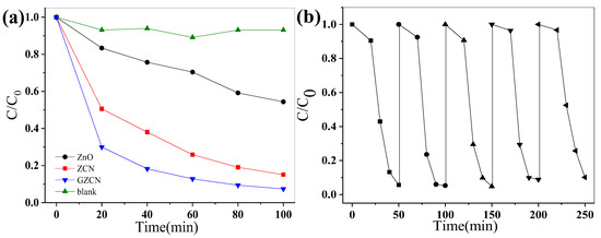 The different samples’ visible activity was tested by decomposing RhB dye under natural solar light, as shown in Figure 7a. ZnO has a low photocatalytic activity, while the ZCN and GZCN composites exhibited a higher photocatalytic activity, demonstrating that the introduction of g-C3N4 and GO can enhance the natural light activity of industrial ZnO. Additionally, in order to evaluate stability, cycle tests were completed and are shown in Figure 7b. Figure 7b shows that the photocatalytic still has high activity after five cycles, meaning that GZCN has high photocatalytic stability.