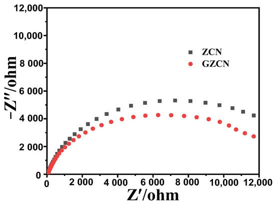 The above experiments demonstrated that ZnO has very high photocatalytic activity after being modified with GO and g-C3N4. Figure 8a displays the UV-vis diffuse reflectance spectra of different samples. All samples have a typical absorption in the UV light region with an edge of 400 nm. After compounding with g-C3N4, the absorption edge starts moving to the visible light region, for which there is a small enhancement for visible light absorption. Furthermore, it is not hard to find that the GZCN composite has a stronger absorption ability than the ZCN composite in the visible light region, implying that GO can enhance the light absorption ability of ZnO for visible light. According to the Kubelka–Munk formula [αhv = A(Eg−hv)n/2] [34], the band gap energies of ZnO, ZCN, and GZCN are 3.08 eV, 2.52 eV, and 2.43 eV, respectively (shown in Figure 8b). Notably, ZnO has a narrower band gap compared to the ordinary ZnO (3.20 eV), which can be caused by its impurities. Figure 9 shows the electrochemical impedance spectroscopy (EIS) of different materials. It is clear that ZCN has a larger slope compared to GZCN, illustrating that the conductivity of GZCN is higher than that of ZCN.