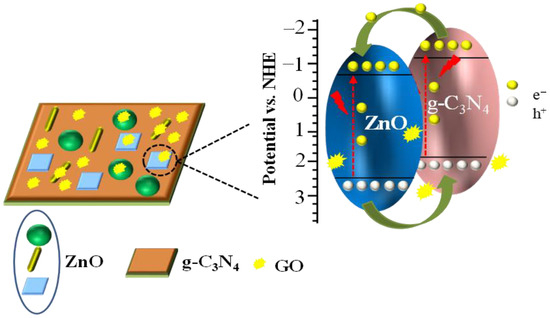 A possible enhancement mechanism of photocatalytic property was proposed, as shown in Figure 10. The pure ZnO is supported on g-C3N4 sheet, and a small amount of graphene oxide is dispersed on the g-C3N4 nanosheet or pure ZnO. The introduction of g-C3N4 not only enhances its absorption in the visible region but can also form a heterojunction with pure ZnO, reducing the composite probability of photogenerated electron–hole pairs. The photogenerated electrons transfer from the conduction band of g-C3N4 to the conduction band of ZnO, while the holes migrate from the valence band of ZnO to the valence band of g-C3N4, inhibiting the recombination of photogenerated electron–hole pairs and improving the photocatalytic activity of ZnO [35]. In addition, owing to its excellent conductivity ability, graphene oxide (GO) can reduce the electrical resistance of the composite, promoting the mobility rate of photogenerated electron–hole pairs, leading to a further increase in the photocatalytic activity of ZCN.