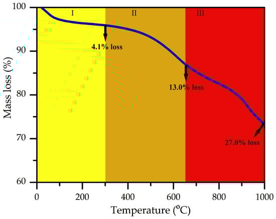 The biochar exhibited a bulk density of 120.4 kg m−3, low moisture content (6.51%), and low volatile matter content (21.24%) (Table 1), characteristics that indicate thermal stability and resistance to microbial degradation. These results demonstrate thermal stability and microbial resistance, as the low moisture content and reduced volatile matter limit the availability of degradable organic fractions and free water, both critical for microbial proliferation [21]. These findings are supported by the thermogravimetric analysis (TGA) (Figure 1), which demonstrates relative thermal stability up to approximately 400 °C. The TGA curve of the biochar exhibits three stages with different weight loss rates. The initial stage (Stage I), from room temperature to 300 °C, involves a gradual decrease in mass (4.1%) attributed to the loss of surface moisture. In the second stage (Stage II), between 300 °C and 650 °C, a more pronounced mass loss (13.0%) is observed, associated with the rapid pyrolysis of residual cellulose, hemicellulose, and lignin in the biochar. The third stage (Stage III), from 650 °C to 1000 °C, is characterized by a slower and continuous mass loss (totaling 27.0% by the end of the analysis), attributed to the degradation of more thermally stable carbon structures [22]. Overall, the high fixed carbon content (68.21%) and atomic H/C ratio of 0.38 indicate a highly aromatic and condensed structure, typical of biochars.