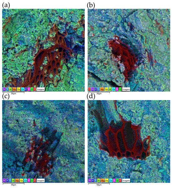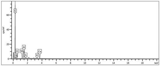 The elemental analysis by EDS (Figure 3) confirmed that the biochar is predominantly composed of carbon and oxygen, with detectable levels of silicon, potassium, calcium, magnesium, and aluminum. Among these, silicon stands out for its reactivity, promoting C-S-H formation [9], while potassium—present at 2.153 g kg−1 (Table 1)—may act as an alkaline activator, accelerating hydration [25]. Thus, despite its high carbon content, the biochar shows potential to positively influence the development of cementitious microstructure, both through its potential pozzolanic activity and chemical activation effects.