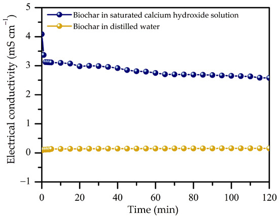 Electrical conductivity reduction in the saturated calcium hydroxide solution in the presence of the biochar.