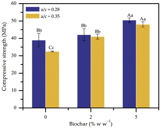 Compressive strength of the biochar–cement composites. Bars of the same color followed by the same lowercase or uppercase letters do not differ significantly according to the Scott–Knott test at a 5% significance level.