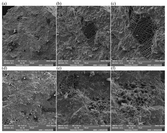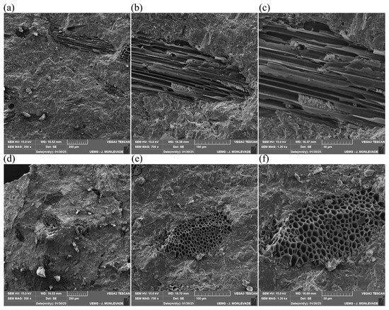 At both concentrations, the porous structure of the biochar is preserved, displaying characteristic interconnected pores, which confirms its potential as a microstructural modulator, contributing to matrix refinement [10,27]. The micrographs (Figure 6c,f) reveal the presence of hydration products adhering to the inner walls of the biochar pores, suggesting that biochar acts as a nucleation site for the formation and growth of cementitious phases such as calcium silicate hydrate (C-S-H) gel and ettringite within its structure [28].