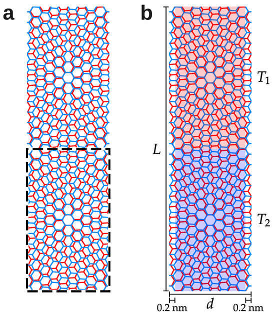 (a) Example of 1 × 2 structure of conventional Moiré unit cells (black dashed line), the twisting angle is 7.34°. (b) A schematic representation of the subregion used in the simulations. The top half, red, is initially set at the temperature K, while the bottom half, blue, at K. Throughout the simulation, atoms at the two non-highlighted edges are constrained to avoid relative translations or rotations between the layers; their width is equal to 0.2 nm.