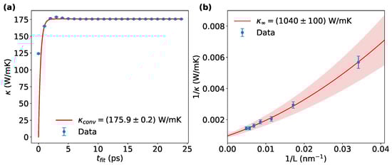 (a) Estimation of as a function of the fitting time for the smallest sample of AA-stacked bilayer graphene. Here, (see text). Convergence was studied by fitting the points with Equation (5). (b) The inverse of the thermal conductivity as a function of the inverse of the length L for AA-stacked bilayer graphene. The fit was performed using the second-order approximation of the Taylor series of Equation (6).