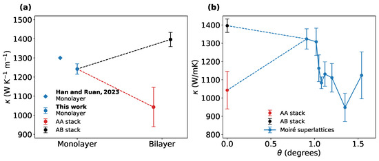 (a) Thermal conductivity for monolayer, AA-stacked and AB-stacked bilayer graphene compared to the value reported by Han and Ruan [44] for the monolayer. Lines are just a guide for the eye. (b) Thermal conductivity as a function of the twisting angle in TBG simulated with the AIREBO potential. Lines are just a guide for the eye.