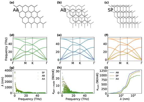 (a–c) Schematic representation of the AA, AB, and SP stacking configuration, respectively. (d–f) Corresponding phonon dispersion relations. (g) MFP spectral distribution, (h) mode-resolved conductivity, and (i) cumulative conductivity (right) for different stacking configurations.