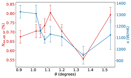 Direct comparison between the thermal conductivity of TBG as a function of the twisting angle (right y-axis, blue dots) and the relative number of perfect AA, AB, and SP stacking configuration in each TBG sample (left y-axis, red dots) calculated as , where N is the total number of atoms in each sample.