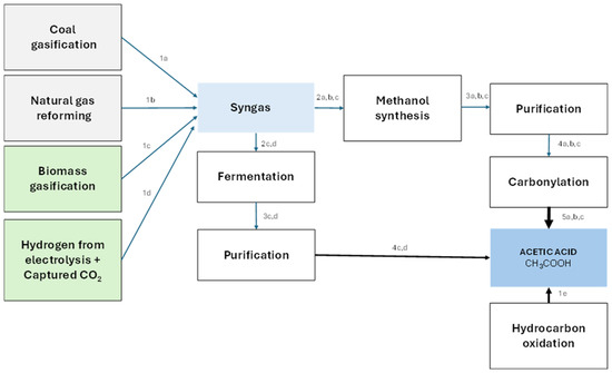 - Martín-Espejo, J.L.; Gandara-Loe, J.; Odriozola, J.A.; Reina, T.R.; Pastor-Pérez, L. Sustainable Routes for Acetic Acid Production: Traditional Processes vs a Low-Carbon, Biogas-Based Strategy. Sci. Total Environ. 2022, 840, 156663. [Google Scholar] [CrossRef] [PubMed]
