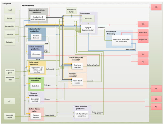 | Acetogenic fermentation | Acetic acid production CO production | Sodium phosphate production | Sulfuric acid (for sodium phosphate production) Acetic acid production |