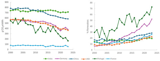 - “Data Page: Carbon Intensity of Electricity Generation”, Part of the Following Publication: Hannah Ritchie, Pablo Rosado, and Max Roser (2023)-“Energy”. Data Adapted from Ember, Energy Institute. Available online: https://ourworldindata.org/grapher/carbon-intensity-electricity (accessed on 25 May 2025).