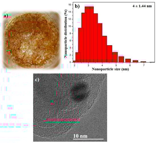 Microwave-assisted synthesis produced a characteristic residue adhering to the walls of the brown-colored beaker (Figure 1a) [20,23]. The CQDs were analyzed using dynamic light scattering (DLS), yielding an average particle size of 4 ± 1.44 nm (Figure 1b). Transmission electron microscopy (TEM) was performed to confirm this particle size, revealing spherical particles approximately 4 nm in diameter (Figure 1c).