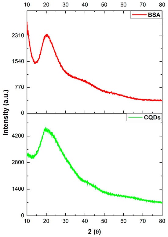 The diffractograms obtained for BSA and CQDs are shown in Figure 2. The analysis was conducted over a 2θ range of 10 to 80°. BSA exhibited an amorphous nature (Figure 2, red line), with a characteristic broad band at 2θ ≈ 19–21°, which is typical for this material [20,24]. Similarly, the CQDs display the same band at 2θ ≈ 19–21° (Figure 2, green line). However, this broad band is attributed to the [002] plane, with an interlayer spacing of 0.448 nm, indicating a graphitic–amorphous structure [20,23,25]. Cutrim et al. reported the presence of another band associated with the graphitic [100] plane at 2θ ≈ 42° (Figure 2, green line), corresponding to an interlayer spacing of 0.217 nm [23]. Ansi et al. also identified a band at 2θ ≈ 44°, corresponding to the amorphous graphitic [101] plane, with an interplanar spacing of 0.202 nm, which is also observed in Figure 2 (green line) [20,25]. It is worth noting that the organic phase of BSA can significantly hinder the detection of crystalline signals. Additionally, variations in CQDs synthesis methods and precursor materials may lead to differences in the resulting diffraction patterns.