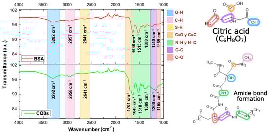 The FT-IR spectrum of CQDs is also shown in Figure 3 (green line). This spectrum exhibits bands at 3292 and 2958 cm−1, assigned to the stretching vibrations of hydroxyl groups (O–H) and carbon–hydrogen (C–H) bonds from aliphatic and aromatic hydrocarbons (alkyl and aryl groups) [25]. A band at 2641 cm−1, also observed in BSA, is associated with the stretching of sulfur–hydrogen (S–H) bonds, indicative of sulfur-containing amino acids [28]. A prominent band at 1701 cm−1 corresponds to carbon–carbon double bonds (C=C) in aromatic rings and the stretching of carbon–oxygen double bonds (C=O) from BSA-derived amino acids [15,29]. Bands at 1645, 1518, and 1389 cm−1 are related to forming amide bonds (C–N and N–H), reflecting the nitrogen content from BSA amino acids [20,30,31,32]. Finally, bands observed at 1200 and 1165 cm−1 are attributed to the stretching vibrations of carbon–carbon (C–C) and carbon–oxygen (C–O) bonds, respectively [15,29].
