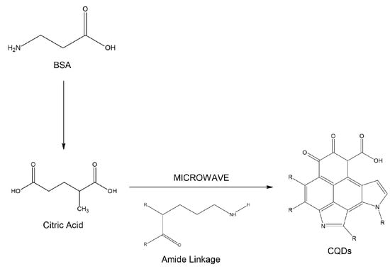 Schematic representation of the chemical reaction between citric acid (C6H8O7) and BSA that leads to N-CQDs forming via microwave-assisted synthesis.