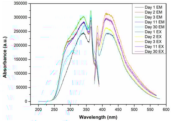 Fluorescence was measured using a Fluorolog-3 spectrofluorometer (Horiba Scientific Jobin Yvon Inc., Piscataway, NJ, USA). Samples were diluted to 10% in distilled water and analyzed at room temperature using an excitation wavelength of 345 nm, a 5 nm excitation slit, and an emission range of 375–600 nm. Luminescence was further visualized using the OmniCure® LX40 UV LED spot curing system.