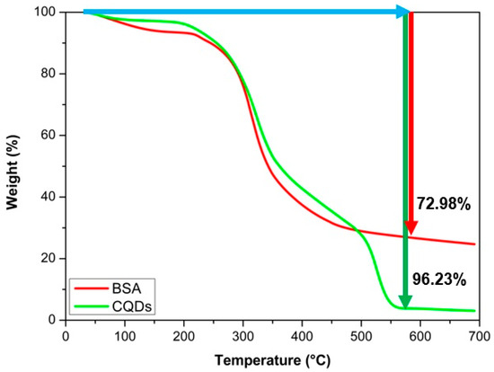 Thermogravimetric analysis of BSA and CQDs. The red arrow indicates the thermal degradation of BSA (72.96% weight loss), while the green arrow marks the degradation of CQDs (96.23% weight loss), highlighting their higher thermal stability.