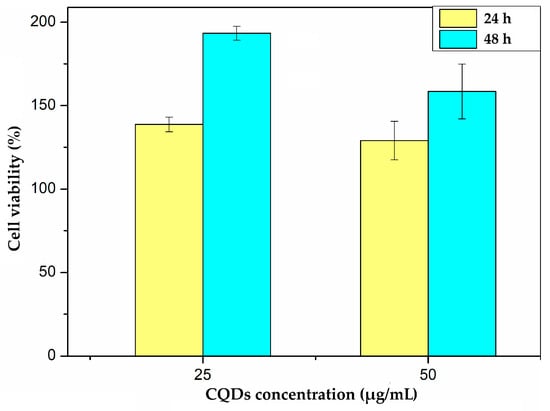 Cell viability percentage of fibroblast cell against CQDs at 25 and 50 µg/mL for 24 and 48 h.
