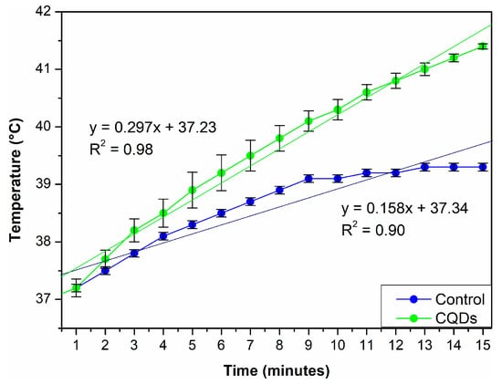 A theranostic agent must achieve temperatures above 41 °C to exert effective therapeutic action, particularly in photothermal therapy, where the goal is to destroy cancer cells while selectively minimizing damage to healthy tissue [42]. This study evaluated CQDs for their photothermal performance under 808 nm NIR laser irradiation (Figure 10). The temperature profile demonstrated that CQDs reached the therapeutic threshold of 41 °C within 15 min and continued to increase to 42 °C by the 23-min mark. In contrast, the control sample (triple-distilled water) exhibited a significantly lower temperature increase, reaching only 39.3 °C. The heating rates were 0.37 °C/min for the control and 0.47 °C/min for the CQDs. While seemingly modest, this 0.10 °C/min difference reflects a consistent and reproducible enhancement in photothermal conversion efficiency due to the presence of CQDs. The higher rate of temperature increases and the greater final temperature in the CQDs increases their ability to absorb NIR light and convert it into heat more effectively than water, which lacks such photothermal properties.