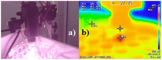 Thermographic images were obtained using an infrared camera. (a) Overview of the measurement setup. (b) CQDs sample after 15 min of irradiation, showing a surface temperature of 41 °C.