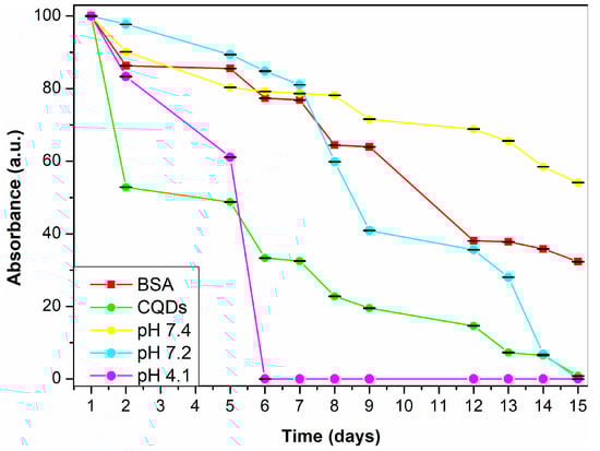 Absorbance percentage of BSA and CQDs at different pH (7.4, 7.2, and 4.1).